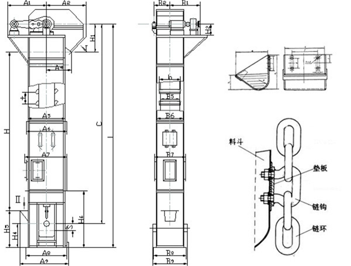 環鏈斗式提升機由運動部分(料斗與牽引鏈條)、帶有傳動鏈輪的上部區段、帶有拉緊輪的下部區段、中間機殼、驅動裝置、逆止制動裝置等組成。本提升機的料斗為間斷式布置,利用“掏取法”進行裝載,“離心投料法”卸料。本斗式提升機的牽引機構是兩根環形鏈條.我公司生產的環鏈斗式提升機,由運動部分(料斗與牽引鏈條)、帶有傳動鏈輪的上部區段、帶有拉緊輪的下部區段、中間機殼、驅動裝置、逆止制動裝置等組成。本提升機的料斗為間斷式布置,利用“掏取法”進行裝載,“離心投料法”卸料。本斗式提升機的牽引機構是兩根環形鏈條。