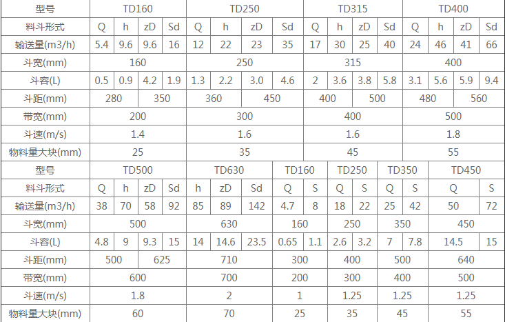 TD型斗式提升機是膠帶提升機,本公司產(chǎn)品根據(jù)斗子寬度可分四個型號:TD160、TD250、TD350、TD450,可采用深斗淺斗滿足不同的生產(chǎn)需求,最大能輸送69.6m3/h物料,提升高度為4-30m。傳動裝置TD型斗提升機的傳動裝置有兩種形式分別配有YZ型減速器ZQ(或YY)型減速器。YZ型軸減速器直接裝在主軸軸頭上,省去了傳動平臺、聯(lián)軸器等,使結(jié)構(gòu)緊湊、重量輕,而且其內(nèi)部帶有異型輥逆止器,逆止可靠。該減速器噪音低,運轉(zhuǎn)平穩(wěn),并隨主軸浮動,可消除安裝應(yīng)力。TD型斗式提升機的牽引件為橡膠帶,料斗以一定的間隔固定在橡膠帶上,橡膠帶分別繞過提升機頭部和底部的滾筒,構(gòu)成具有上升有載分支和下降無載分支的閉合環(huán)形系統(tǒng);工作時,布置在提升機頭部的驅(qū)動裝置通過頭部滾筒將動力傳給橡膠帶和料斗,物料從提升機底部的進料口進入料斗,料斗將物料提升至頭部的卸料口,在離心力和重力的共同作用下,料斗中的物料經(jīng)卸料口卸出。
