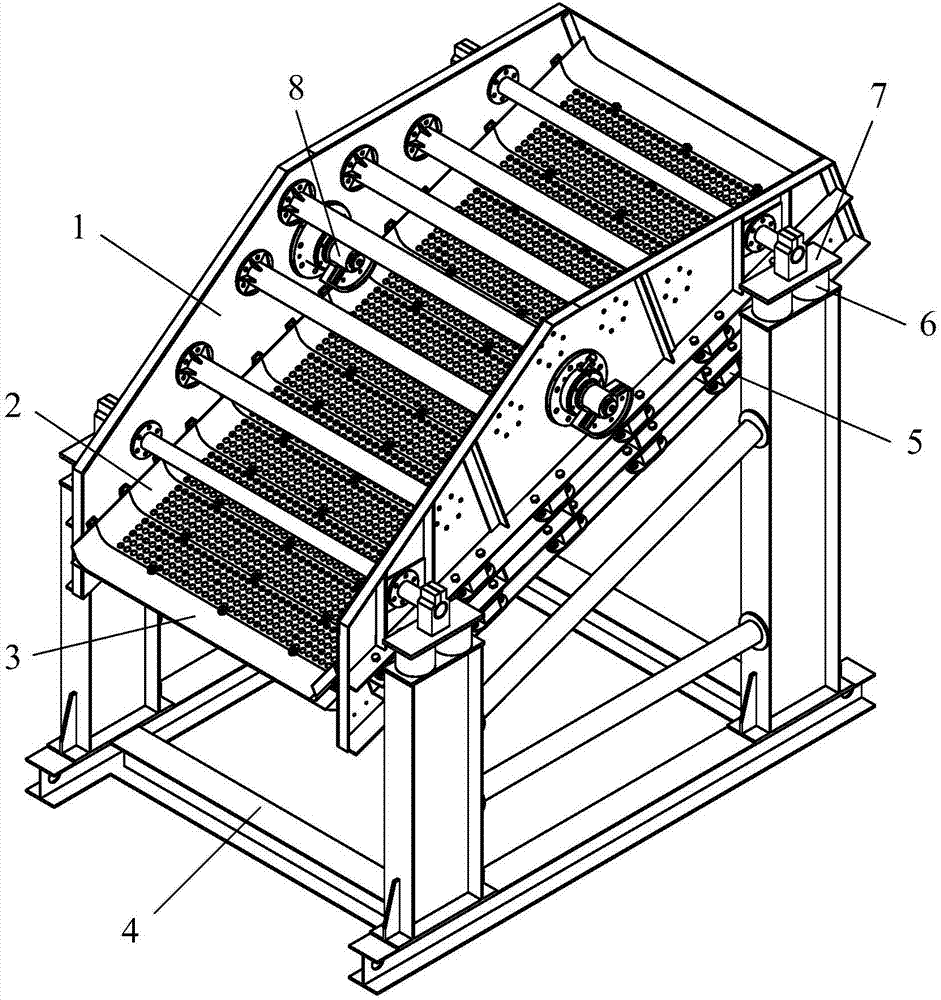 弛張篩是我廠生產的一種新型篩分機械。該機采用雙質體亞共振原理,通過傾斜篩箱上安裝的彈性篩面的弛、張運動拋擲物料的篩分機。其主要特點是篩分效率提高,處理量大,動負荷小,功耗少,噪聲低,因此應用較為廣泛。在這個過程中,彈性聚氨酯篩面以每分鐘800次的頻率連續不斷地擴張、收縮,從而獲得很高的加速度(50g),可處理6mm以下的粘性難篩分的物料,采用獨特的雙重振動原理,即通過共振幫助,使一個基本橢圓振動帶動了其他的一層或多層的浮床曲張,并且浮床曲張振動的振幅遠大于傳統的振動設備的振幅,有效地防止了篩孔堵塞。弛張篩是雙質量振動系統,采用聚氨酚橡膠篩面,支承篩面的任意兩根相鄰橫梁都分別屬于兩個振動質體,其中一個質體是篩箱,另一個質體是配重。在工作時,篩網交替地拉緊和松弛,使物料產生前進彈跳運動,可避免物料黏附篩網并堵塞篩孔。當兩質體相差二相位振動時,任意兩根相鄰橫梁時而靠近,時而遠離,彈性篩面也相應時而松弛,時而張緊,即篩面隨篩箱作牽連運動的同時,還相對篩箱作相對運動。這種弛張運動不僅使篩孔不斷產生變形,而且大大增加了篩面的振動強度,從而有效地克服了篩孔堵塞現象,顯著提高了篩機處理能力。但是因篩箱的振動強度并不大,故機械強度容易保證,但篩面的振動強度較大且反復變形,故篩面壽命較低。根據料群運動自身規律性,鵬威弛張篩可有效的使濕粘物料層松散、分層和透篩。